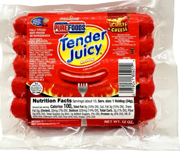 Discover the authentic taste of the Philippines with San Miguel Purefoods Chili Cheese Tender Juicy Hotdog, available at Island Pacific Market. These delicious Filipino hotdogs are made from quality ingredients and are perfect for cooking on the pan or grilling with sweet barbecue sauce. This is also a staple for Filipino style Spaghetti. Renowned for its unbeatable flavor and juiciness, this hotdog is a favorite in every household.